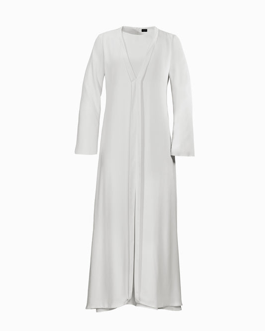 Sav Abaya is made with an outer layer of lightweight Georgette with specially customized anti-UV property. Fully lined with TENCEL™ Modal from LAFIYE's SKIVVY series, known for its anti-bacterial feature. The dress has a straight, minimal cut with a tonal panel at the center. The materials are soft, breathable, and allow easy movement.
