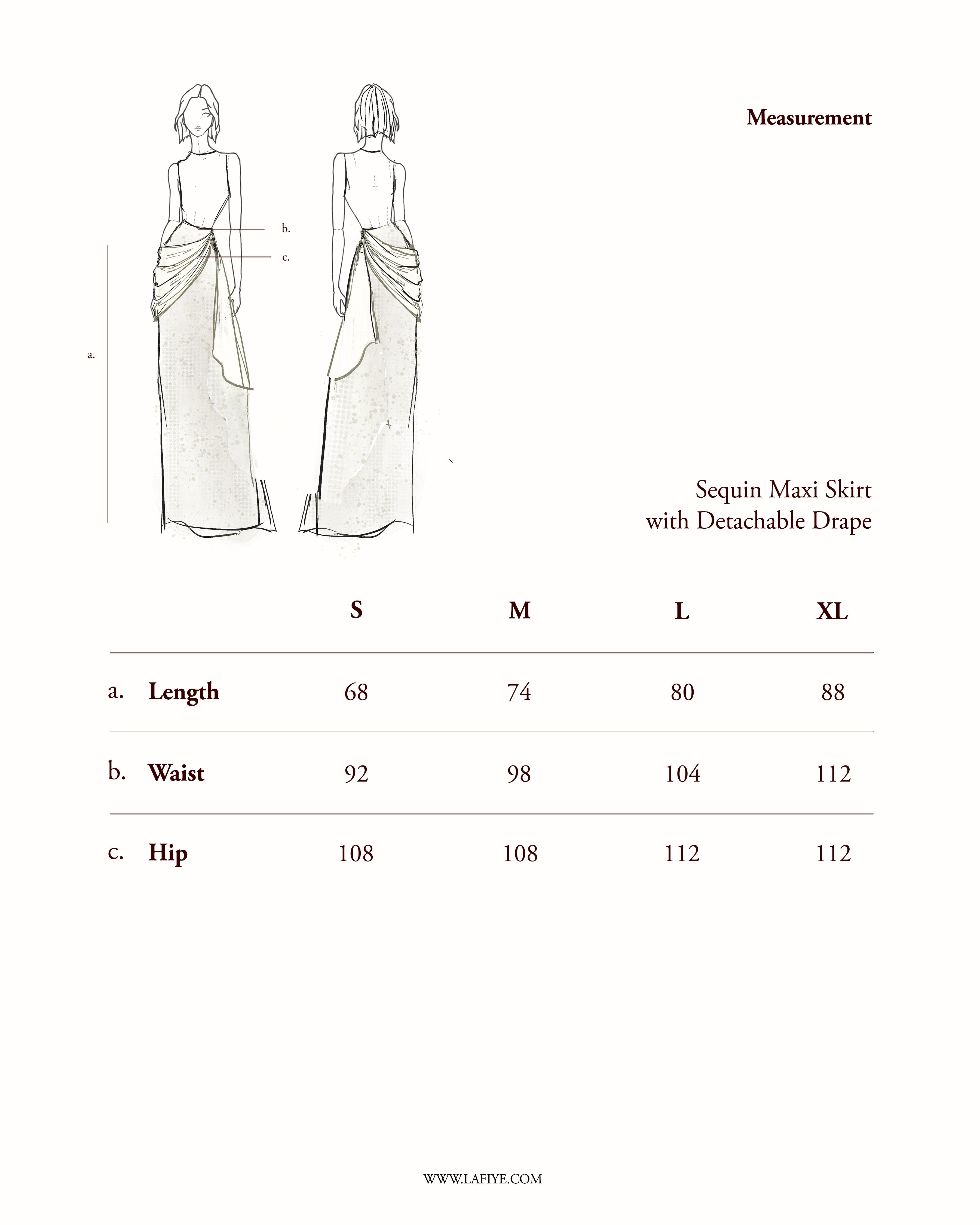 Cut in a straight, elongated line, the skirt shimmers in all-over sequins. A back slit lends freedom of movement, while dual waist-side buttons allow for the attachment of a fluid Charmeuse Silk drape, transforming its profile from minimal sparkle to layered drama. Finished with a concealed zipper, it balances opulence with adaptability.